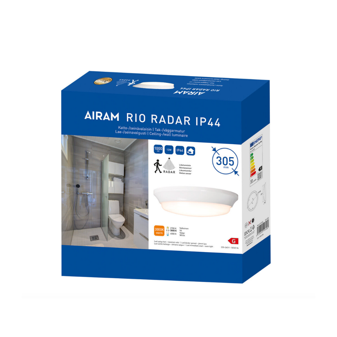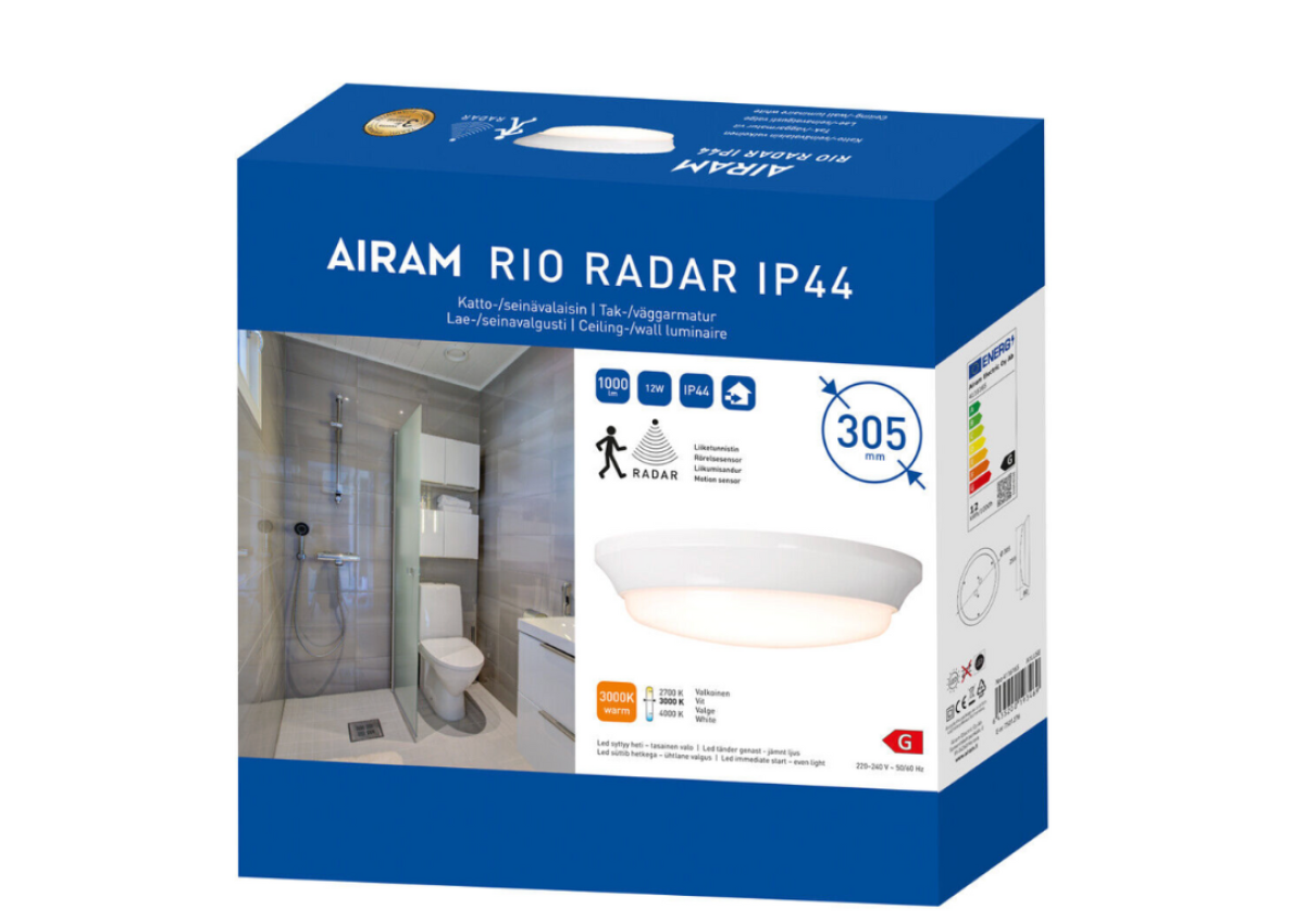Rinkitės „Airam Rio“ lubinį šviestuvą bendram apšvietimui patalpose, kur šviestuvo korpusas ir difuzorius turi atlaikyti šaltį, karštį ir drėgmę. „Rio“ tinka darbinei temperatūrai nuo 0 iki 25 °C, jį galima montuoti tiesiai ant sieninės arba lubinės jungiamosios dėžutės – idealiai tinka vonios kambariams, pagalbinėms patalpoms, garažams ir automobilių stoginėms. Pagaminti iš patvaraus polikarbonato, IP44 klasės atsparūs vandens purslams šviestuvai pasižymi aukščiausiu atsparumu mechaniniams smūgiams – IK10. Integruotas šviesos diodas užtikrina tolygų šviesos paskirstymą. Galima rinktis iš dviejų spalvų temperatūrų: baltos 3000 K arba šaltai baltos 4000 K. Radaro jutiklio modelis turi reguliuojamą mikrobangų aptikimo diapazoną, laiko uždelsimą ir prieblandos jutiklio nustatymus.