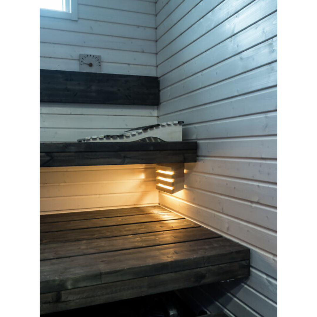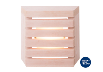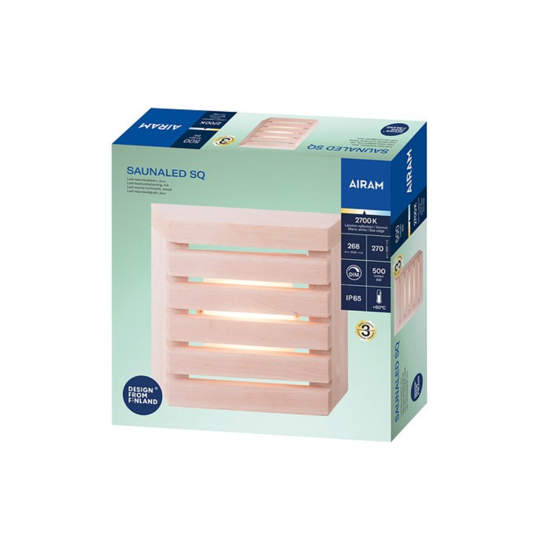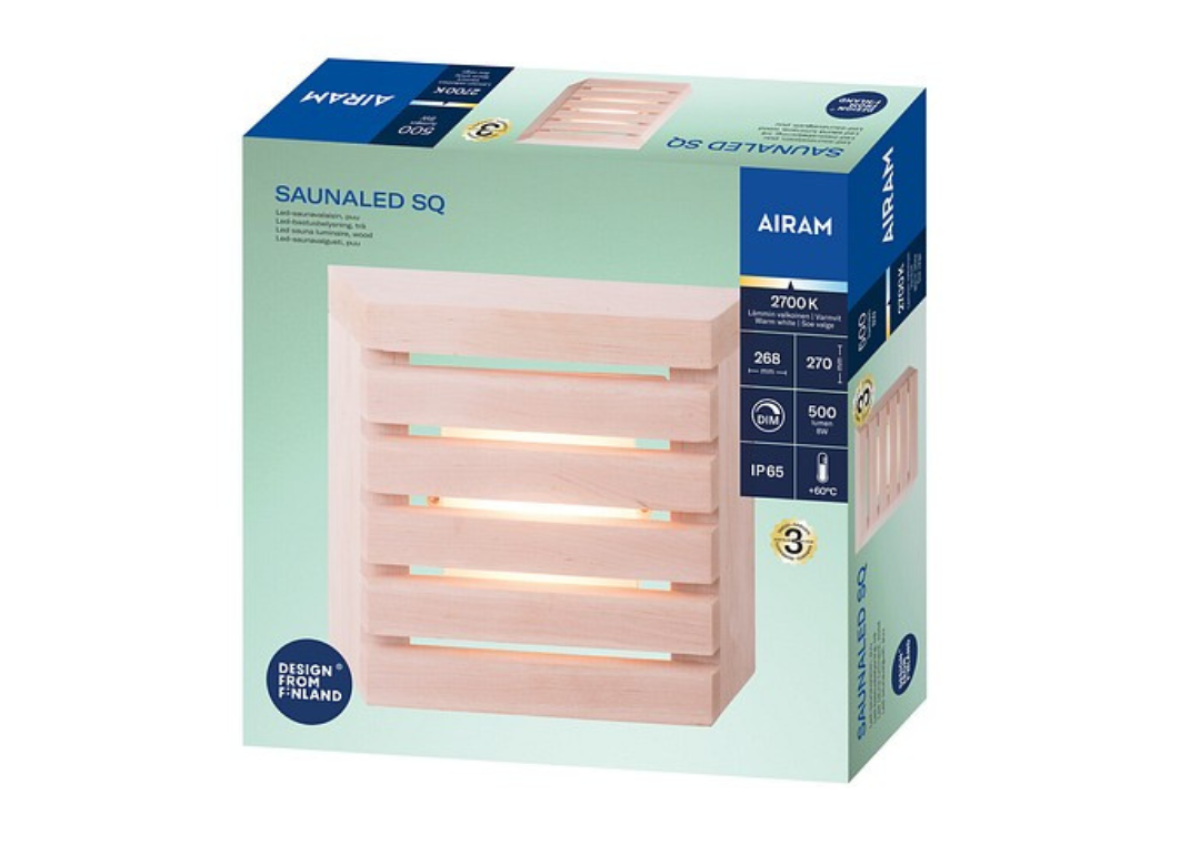 „Saunaled Sq“ (kvadratinis) – stilingas pirties šviestuvas su integruotu kintamosios srovės LED apšvietimu. Medinis gaubtas pagamintas Suomijoje iš aukštos kokybės vietinės alksnio medienos. Šviestuvas yra pritemdomas, todėl galite reguliuoti šviesos srautą pagal aplinką. Dulkių ir vandens nepraleidžiantis šviestuvas gali būti montuojamas ant paviršiaus arba įleidžiamas į sieną. Rekomenduojame prieš naudojimą medines dalis apdoroti medienos apsaugos priemone. Medieną taip pat galite tonuoti, kad ji derėtų prie jūsų pirties interjero. Gaminys pažymėtas „Design from Finland“ ženklu.